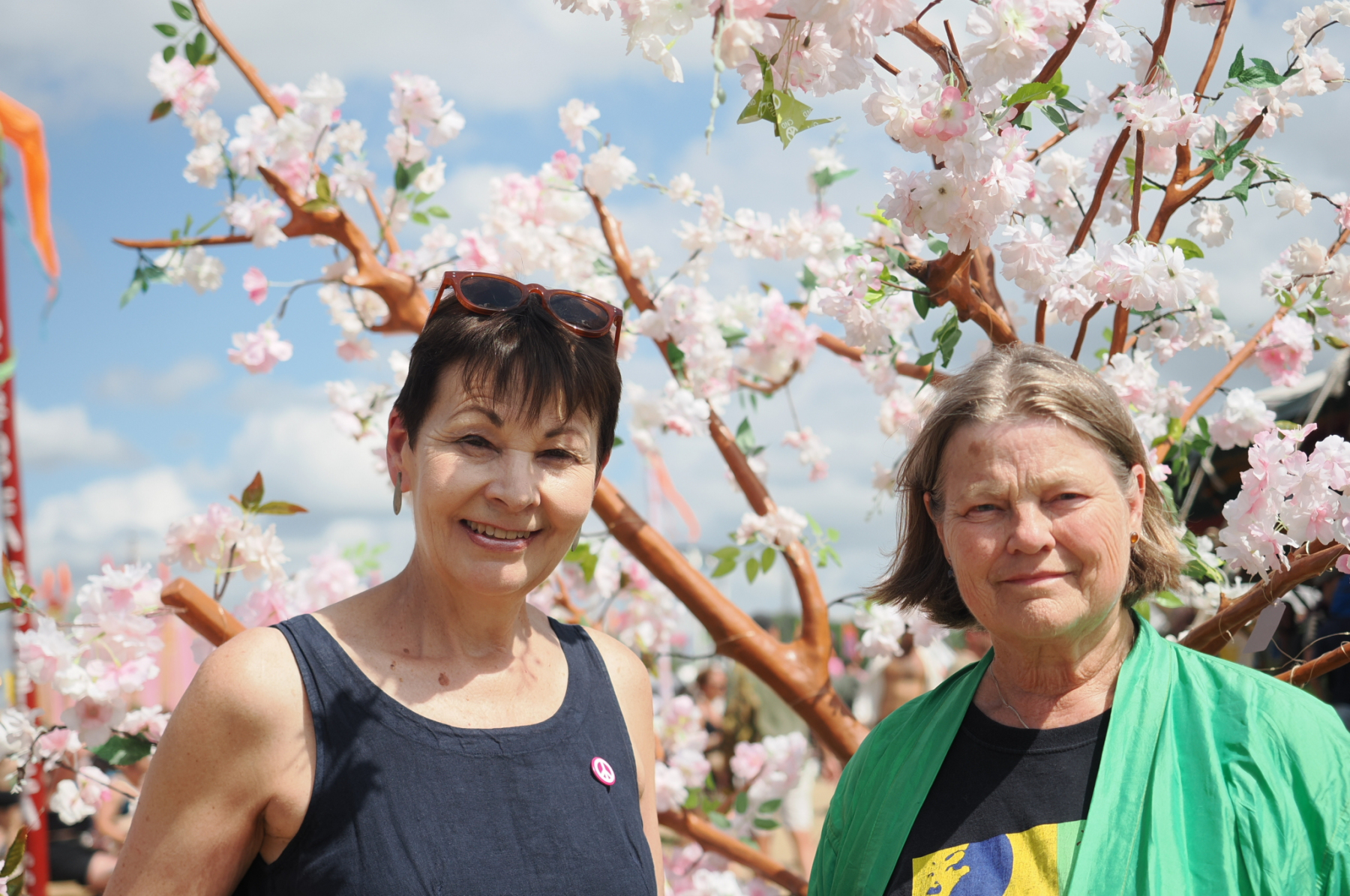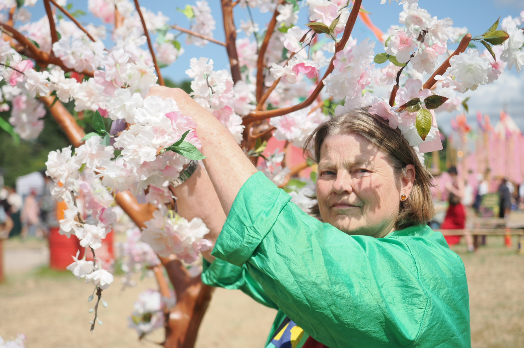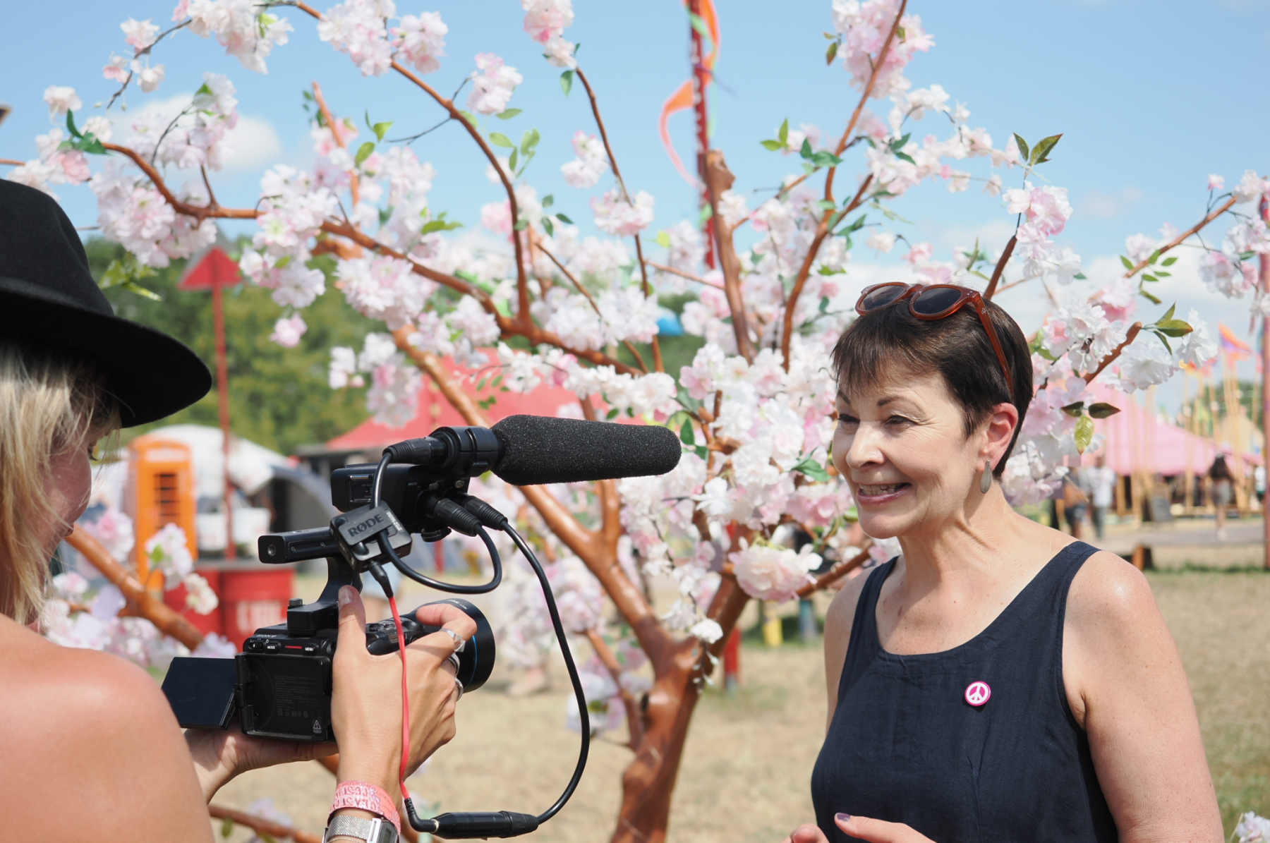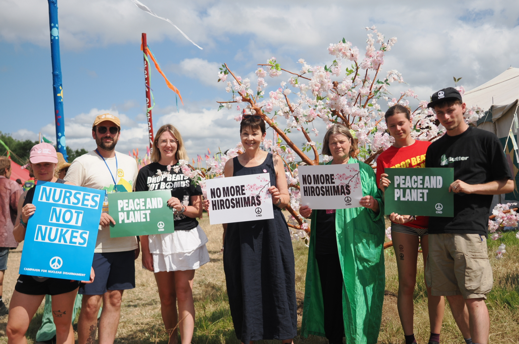 Visitors to Green Futures could also take part in commemorating the 80th anniversary of the atomic bombings of Hiroshima and Nagasaki by attaching a message of peace to our hand-crafted cherry blossom tree (a massive thanks to Martin and Olivia at AWOL Outdoor Arts for their time and skills in bringing this creation to life!). These messages will be delivered to Japan by CND Vice-President Caroline Lucas in August – who also gave a powerful speech on behalf of CND from the Pyramid stage (watch on Instagram here and Facebook here). Meanwhile at Speakers Forum, CND Vice-President Rebecca Johnson spoke at a session on nuclear war.