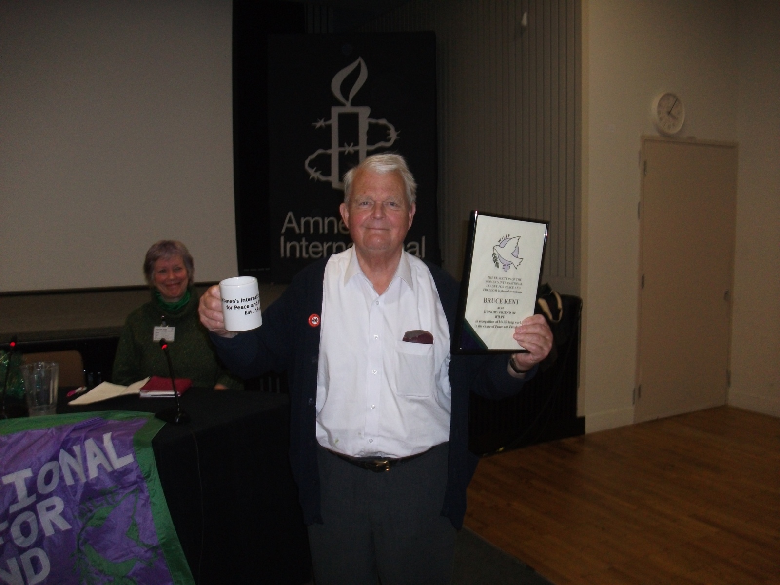 WILPF member Helen Kay sent us some pictures of Bruce at some of their events saying he was “at his most inspirational, funny, friendly but with a serious message of working for peace: if we invested as much in peace making as we do in military spending, what a wonderful world this would be.”