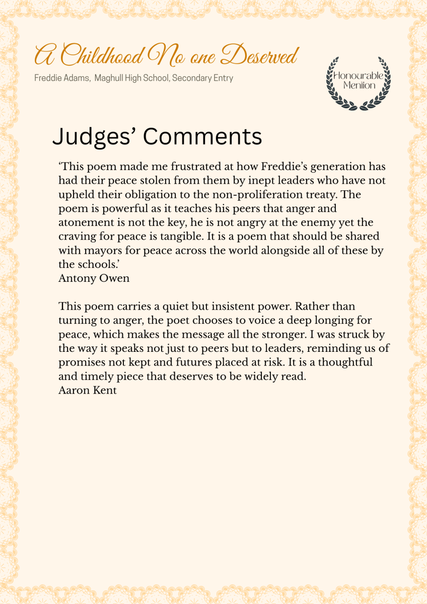 Earlier in the year, we did a nation wide call out for students to submit original poems to commemorate the 80th anniversary of the bombings of Hiroshima and Nagasaki. Our competition was judged by poet and CND Peace Education patron Antony Owen along with poet and publisher Aaron Kent.
