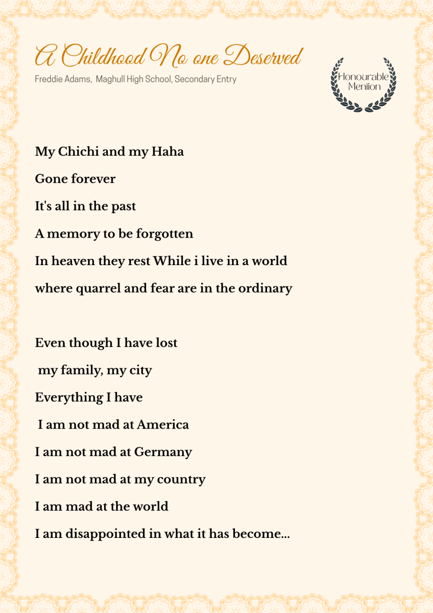We were incredibly impressed by the entries, and are pleased to announce the winners, who will be celebrated at an event in London where they will get the opportunity to recite their poems! Find below the winning poems along with the judges’ comments.