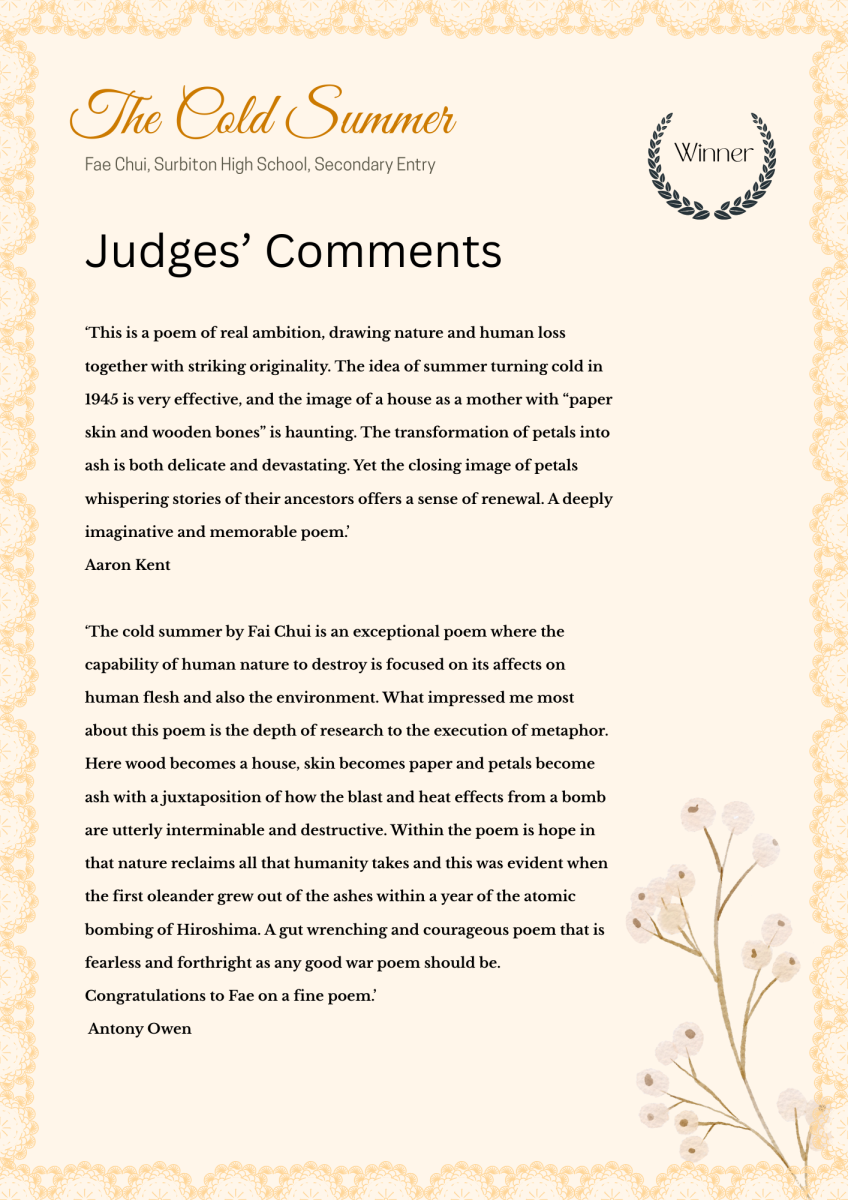 We were incredibly impressed by the entries, and are pleased to announce the winners, who will be celebrated at an event in London where they will get the opportunity to recite their poems! Find below the winning poems along with the judges’ comments.